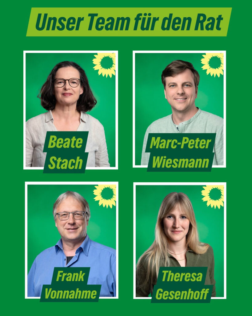 Die grünen Mitglieder, die sich im Rat der Stadt Waltrop für die Themen Demokratie, Vielfalt und Klimaresilienz und vieles mehr engagieren, setzen sich aus neuen (Theresa) und bereits bekannten grünen Mitgliedern (Beate, Marc, Frank) zusammen.
